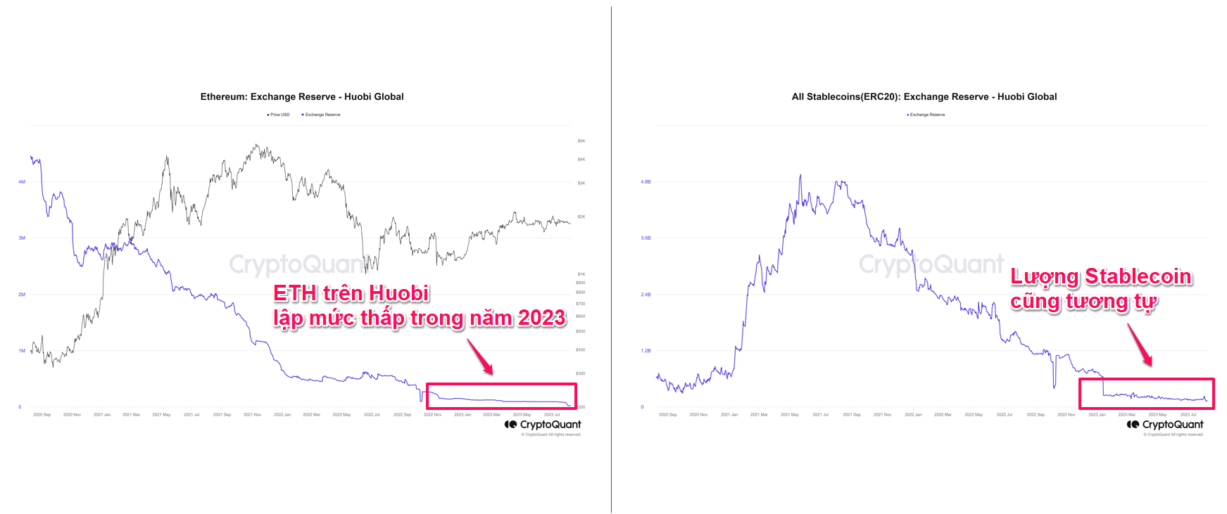 Từ cuối năm 2022 cho đến nay, lượng ETH và Stablecoin (ERC-20) trên Huobi đều đã lập mức thấp mới và chưa có tín hiệu phục hồi trở lại. Như vậy: