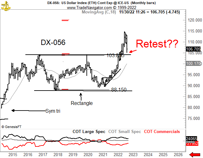 Biểu đồ DXY trong khung thời gian tháng như trên cho thấy mức điểm hiện tại đang rất gần với hỗ trợ lớn của suốt 5 năm qua. Trong năm vừa qua, cũng chính Peter Brandt đã gợi ý khả năng DXY sẽ tăng đến 119 – 120. Dù DXY đạt được đến vùng này, nhưng trong phân tích kỹ thuật, hành vi re-test rất bình thường để rồi sau đó xu hướng chính được tiếp diễn.