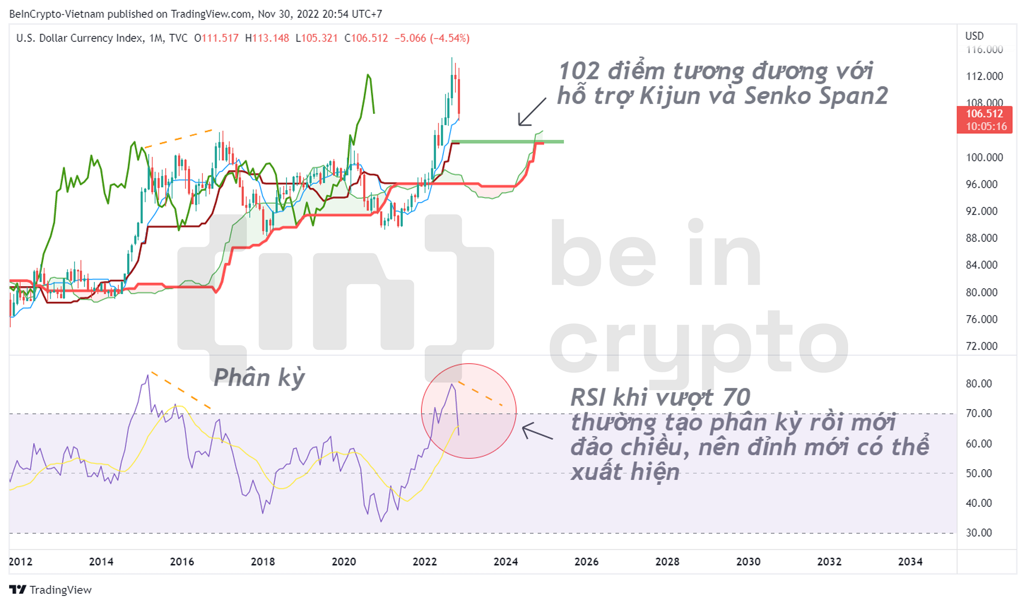 - Dưới góc nhìn RSI, khi RSI khung tháng vượt 70 thì muốn đảo chiều ít nhất cần có một tín hiệu phân kỳ đỉnh. Trong khi đó, chưa có tín hiệu phân kỳ đỉnh nào trong năm 2022. Do đó, một đỉnh mới trong năm 2023 sẽ đáp ứng điều kiện đủ đó trước khi DXY đảo chiều.
