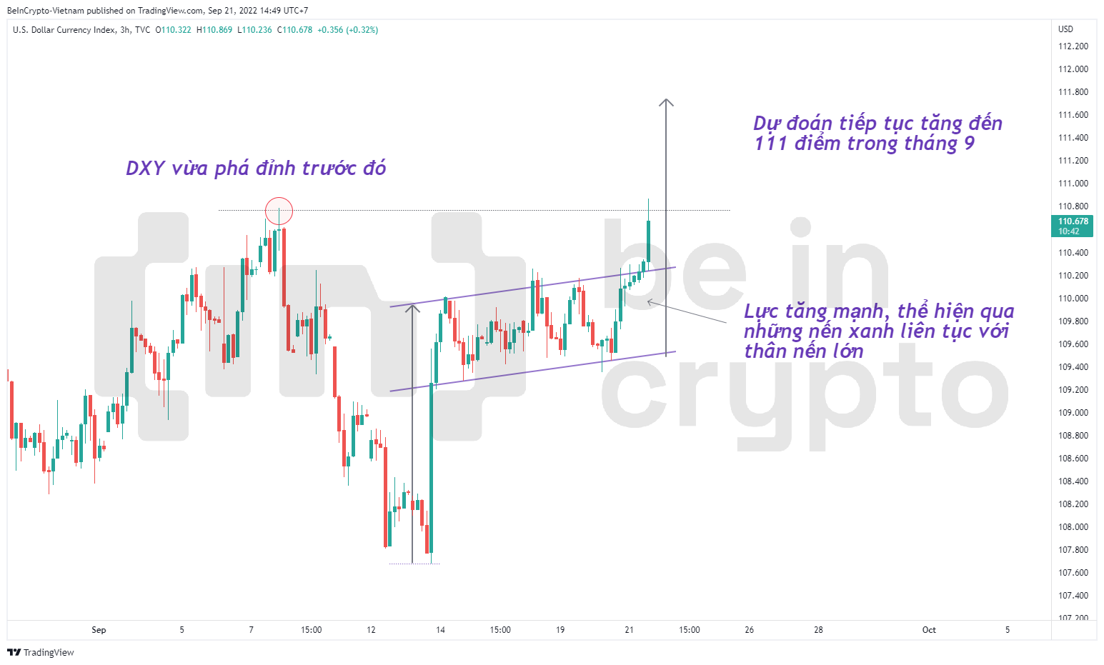Quan sát trong khung 3h, DXY liên tục duy trì những nến xanh với thân nến dứt khoát. Mô hình cờ tăng được hình thành từ ngày 14/9 đến nay và đang hướng đến mức 111 điểm.
