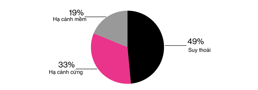 Dữ liệu của Bloomberg trong cuộc khảo sát chuyên gia về việc nước Mỹ có rơi vào suy thoái trong 24 tháng tới cho thấy tình huống “hạ cánh mềm” nhận ít niềm tin nhất trong khi đến 49% cho rằng suy thoái sẽ đến trong 2 năm tới.