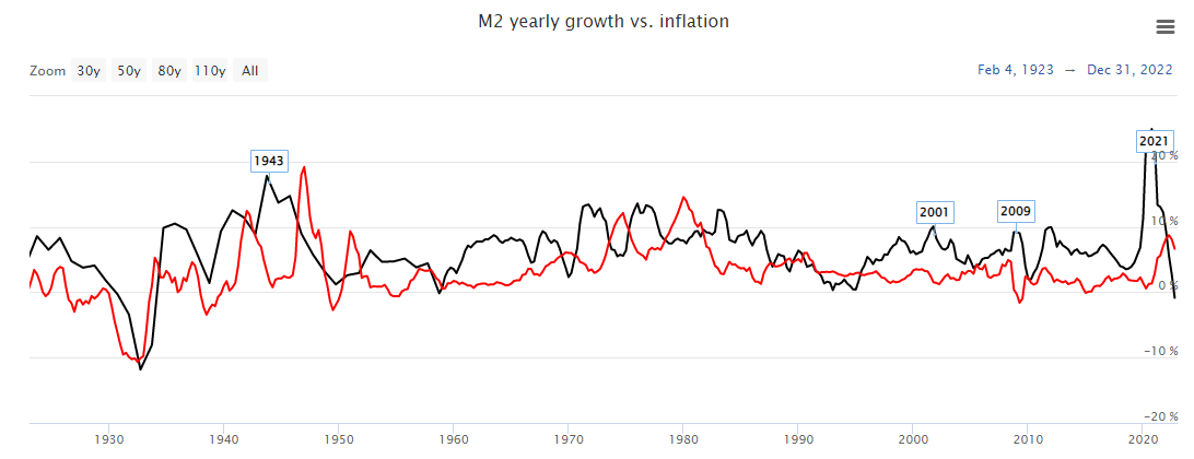 Đường màu đen là tỷ lệ thay đổi nguồn cung M2 (Hoa Kỳ). Từ 2021 đến nay, nguồn cung M2 đã ghi nhận tốc độ suy giảm nhanh và mạnh chưa từng thấy kể từ cuộc Đại suy thoái (The Great Depression) vào năm 1929. Gần một năm trăm trôi qua, nền kinh tế Hoa Kỳ mới chứng kiến một hiện tượng như thế này lặp lại.