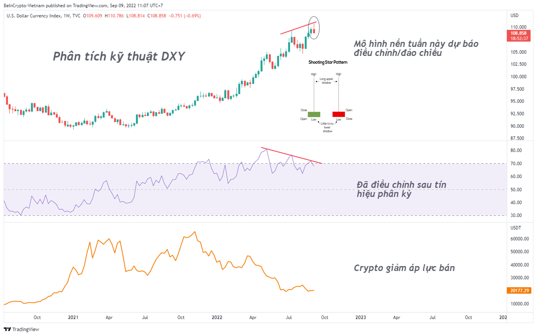 Sponsored- Như vậy, ít ra tín hiệu phân kỳ đã hoàn thành một phần vai trò của nó. Bên cạnh đó, mô hình nến tuần này dù chưa đóng nến nhưng khả năng cao sẽ là một nến shooting star màu đỏ. Đây cũng là mô hình nến dự báo điều chỉnh. Việc DXY có đảo chiều hay không cần quan sát thêm nến tuần sau.