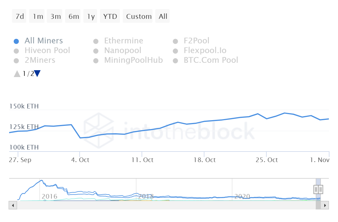 Doanh thu tăng khiến cho việc miner không có ý định bán ETH của mình. Do đó, tổng dự trữ ETH của họ trong suốt tháng 10 đã tăng 23,000 ETH.