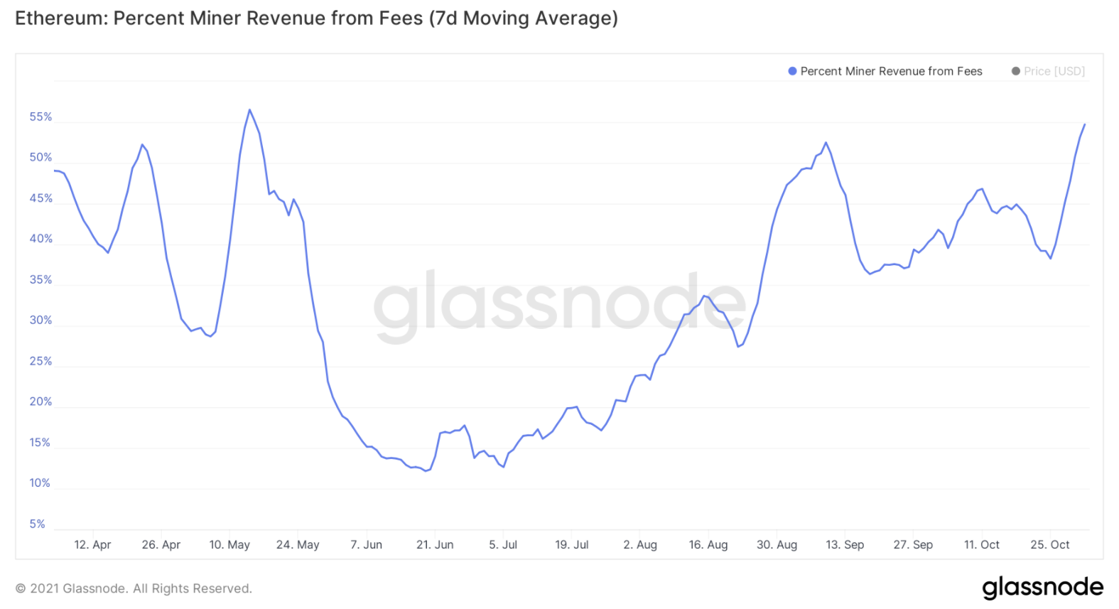 Ethereum (ETH) đã đóng nến tháng 10 với mức tăng trưởng 43%. Mặc dù có hơn 710,000 ETH đã bị đốt tính đến hết tháng 10/2021 nhưng lợi nhuận của các thợ đào (miner) trong tháng 10 vẫn giữ ở mức cao. Có vẻ như EIP-1559 vẫn chưa thực sự tác động đến thu nhập của miner.