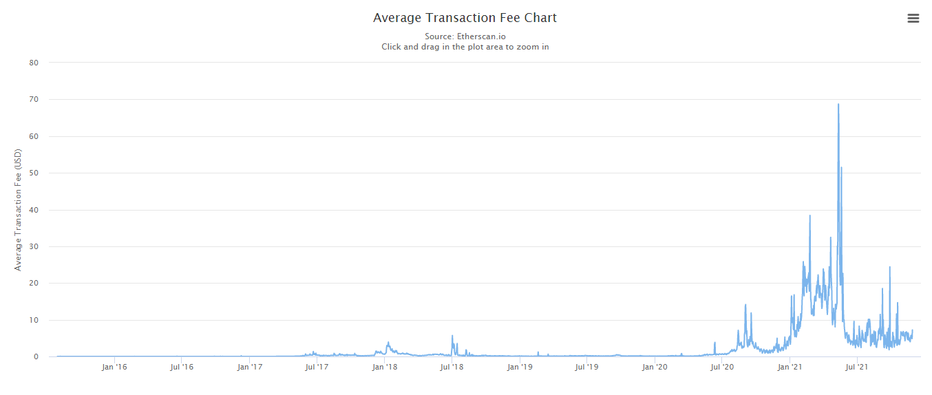 Từ trước đến nay, phí gas cao vốn vẫn là một “đặc sản” trên mạng Ethereum. Theo dữ liệu thống kê từ Etherscan, tại thời điểm viết bài, phí giao dịch hiện đang ở mức 7.22 USD. Mức này đã cao hơn rất nhiều so với thời điểm đầu năm 2021.