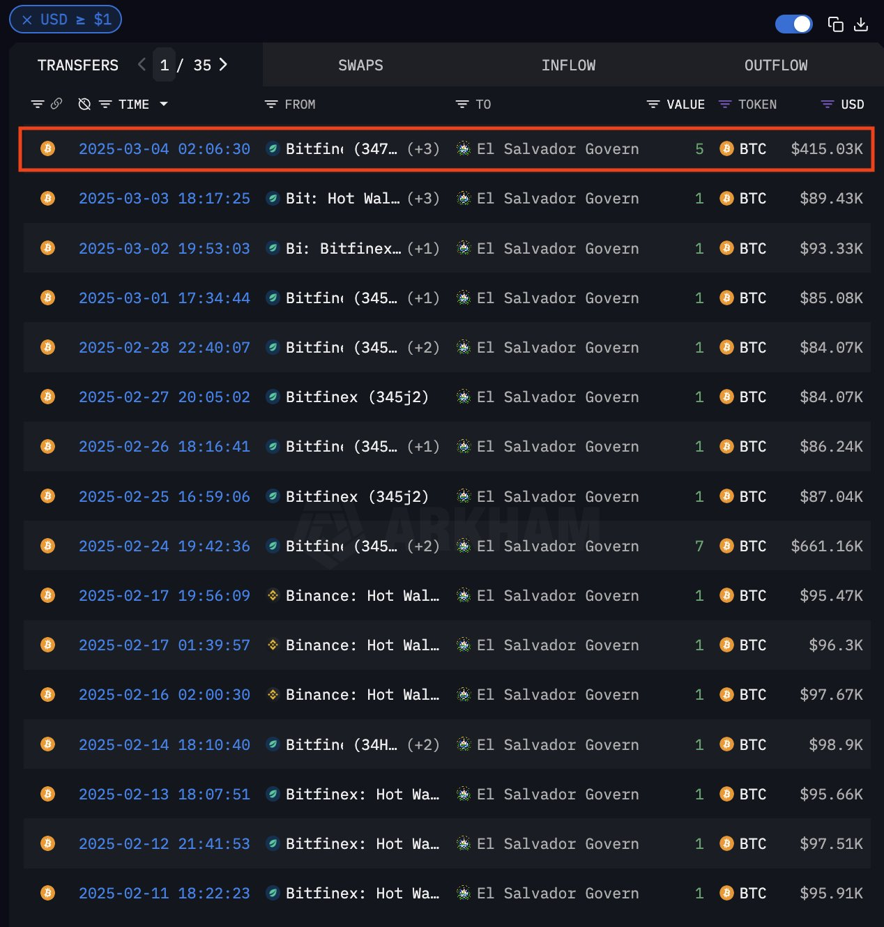 Tuy nhiên, chính phủ El Salvador vẫn tiếp tục mua 1 BTC mỗi ngày như một phần của chiến lược dài hạn để tích trữ tài sản này. Hôm nay, họ đã mua thêm năm Bitcoin, tiếp tục mâu thuẫn với chỉ thị này.