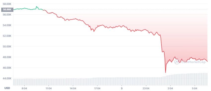 Chỉ trong một ngày, giá Bitcoin trải qua một sự điều chỉnh khoảng 40% so với mức cao nhất mọi thời đại. Vào thời điểm viết bài, Bitcoin đã tăng nhẹ, giao dịch ở mức khoảng 47,000 USD.
