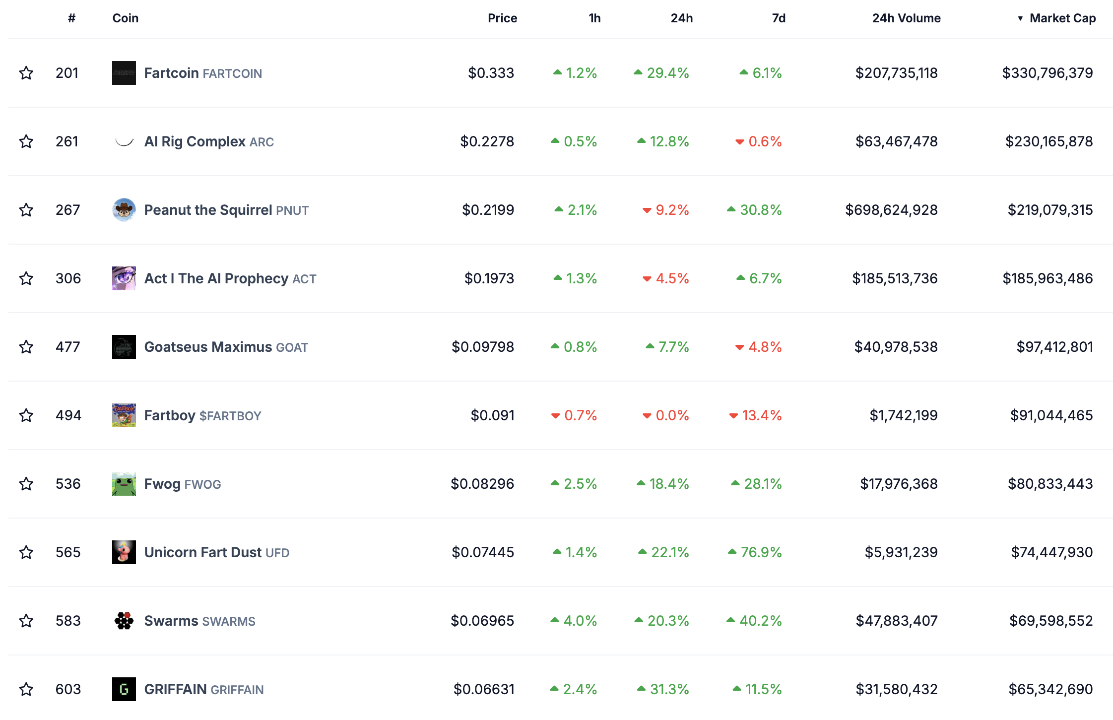 Chỉ có bốn token vượt qua ngưỡng vốn hóa thị trường 100 triệu USD: Fartcoin (FARTCOIN) với 330 triệu USD, AI Rig Complex (ARC) với 230 triệu USD, Peanut the Squirrel (PNUT) với 219 triệu USD, và Act I The AI Prophecy (ACT) với 185 triệu USD.