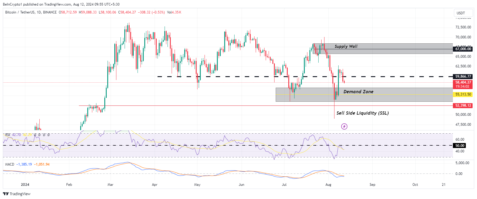 Khi BTC quay trở lại vùng cầu, khối lệnh này có thể cung cấp một cơ hội mua tốt. Tuy nhiên, điều này phụ thuộc vào việc mức 55,313 USD có giữ vững làm sàn hỗ trợ trong khung thời gian một ngày hay không. Các chỉ báo động lượng như Chỉ số Sức mạnh Tương đối (RSI) cho thấy sự thiếu quyết đoán trong số các nhà đầu tư lạc quan.