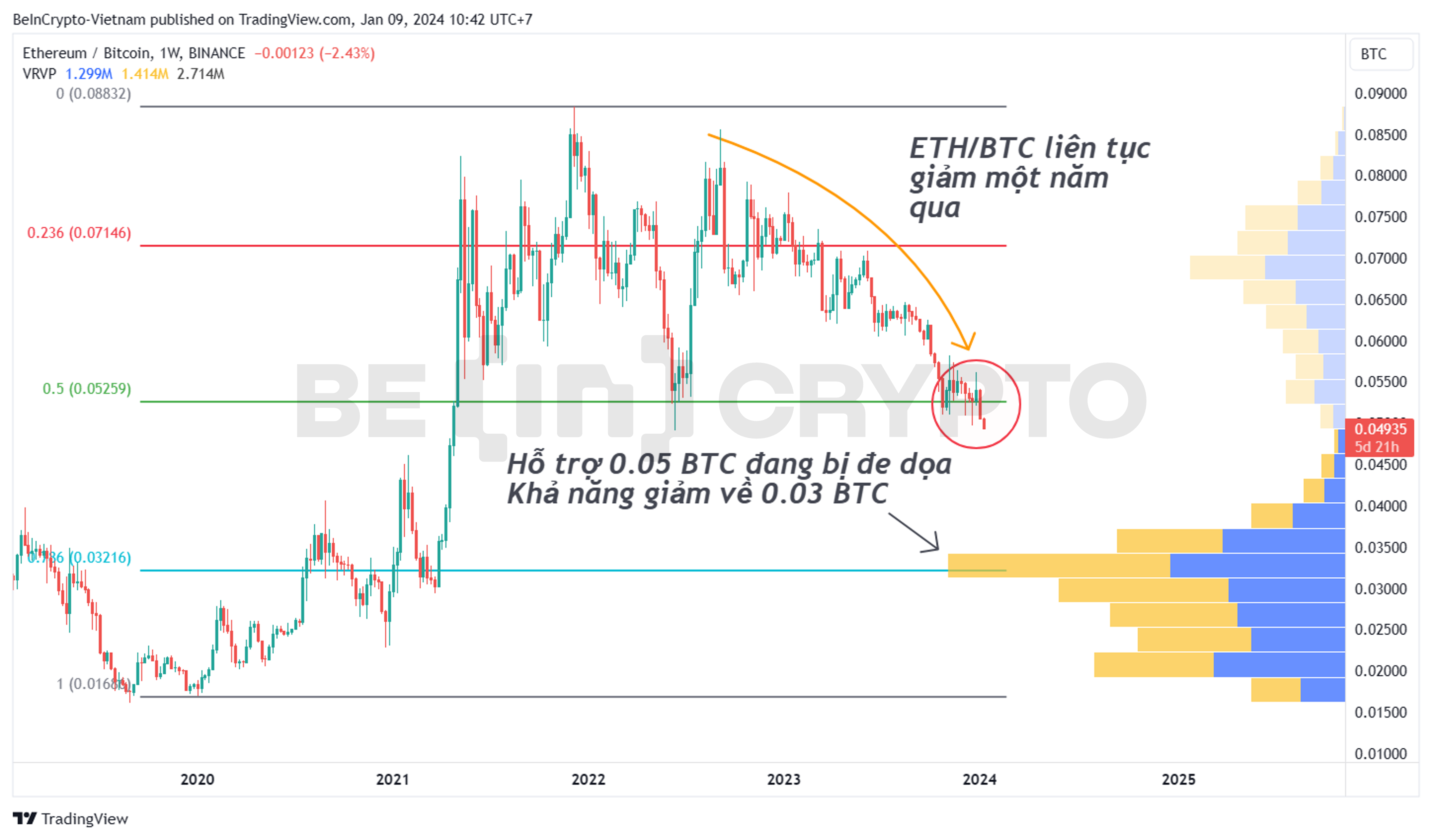- Có thể thấy từ đầu 2023 đến nay, ETH/BTC là một xu hướng giảm. Trong năm qua, nhà đầu tư dù ở trong giai đoạn tăng giá hay giảm giá hay đi ngang, đều ưu tiên dành tiền cho BTC hơn là cho ETH. Đến đầu 2024 này, thì hỗ trợ 0.05 BTC đang bị đe dọa khi ETH/BTC giảm về mức thấp của 2 năm mà không thể hiện động thái phục hồi mạnh.