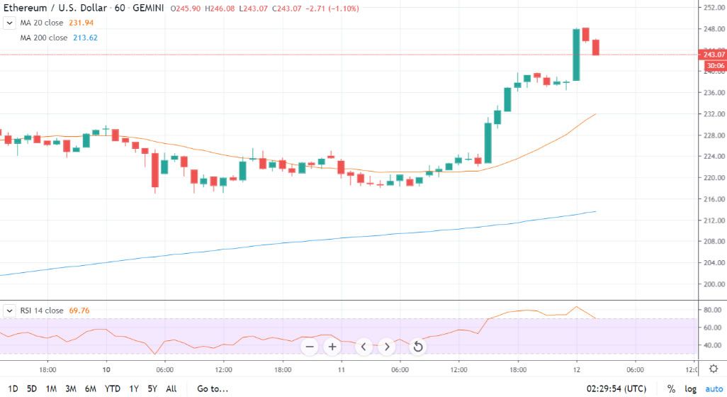 Đợt gia tăng thứ hai giúp ETH nhảy lên một chút đến vị trí 250 USD.