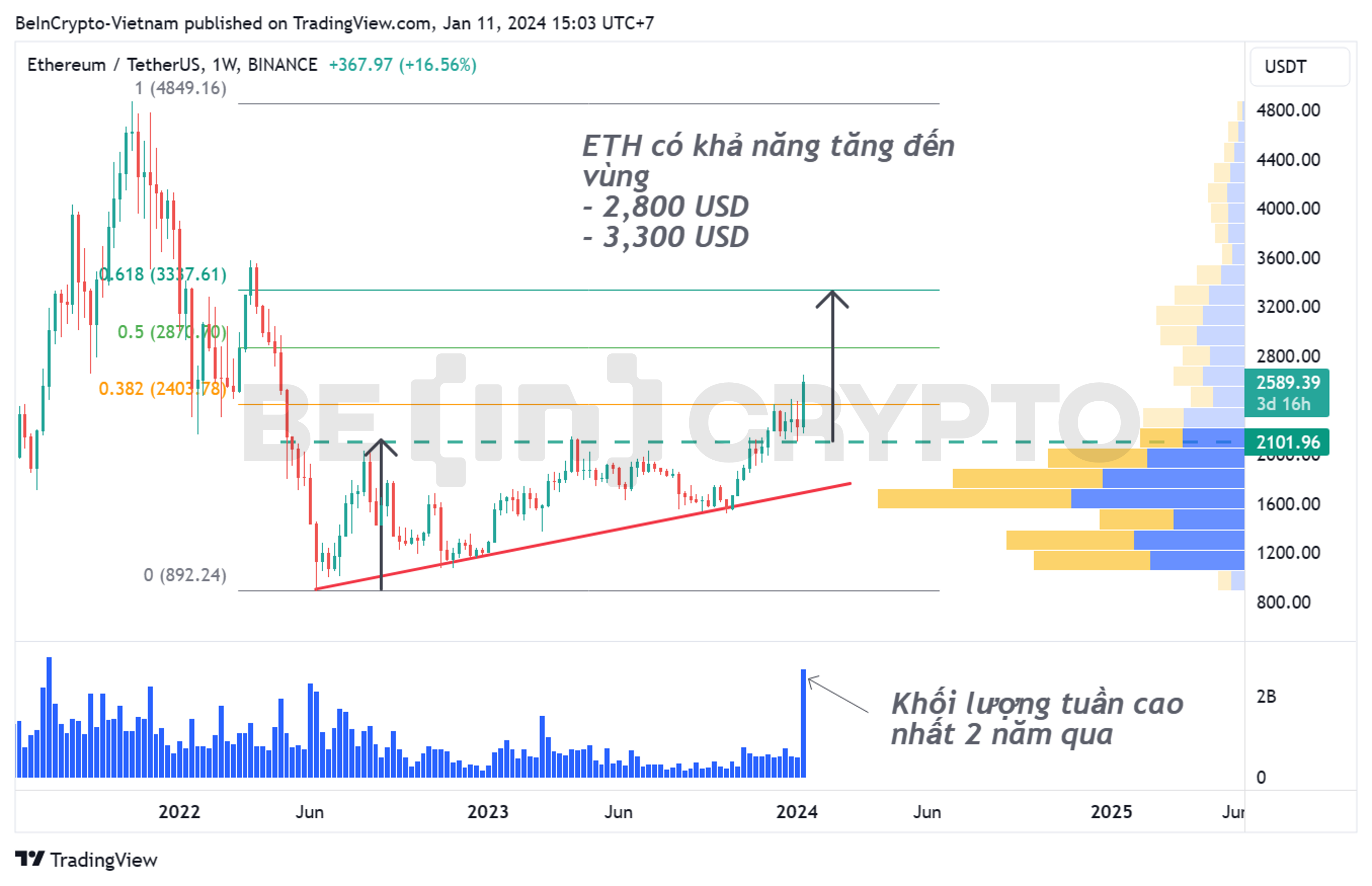 Như dự đoán của phân tích trước, giá ETH đã re-test lại vùng 2,100 USD và tăng mạnh sau đó. Đà tăng mạnh ngày gần đây đã mở ra khả năng giá có thể tiếp tục tăng đến 2,800 USD và thậm chí 3,300 USD trong quý đầu năm 2024.
