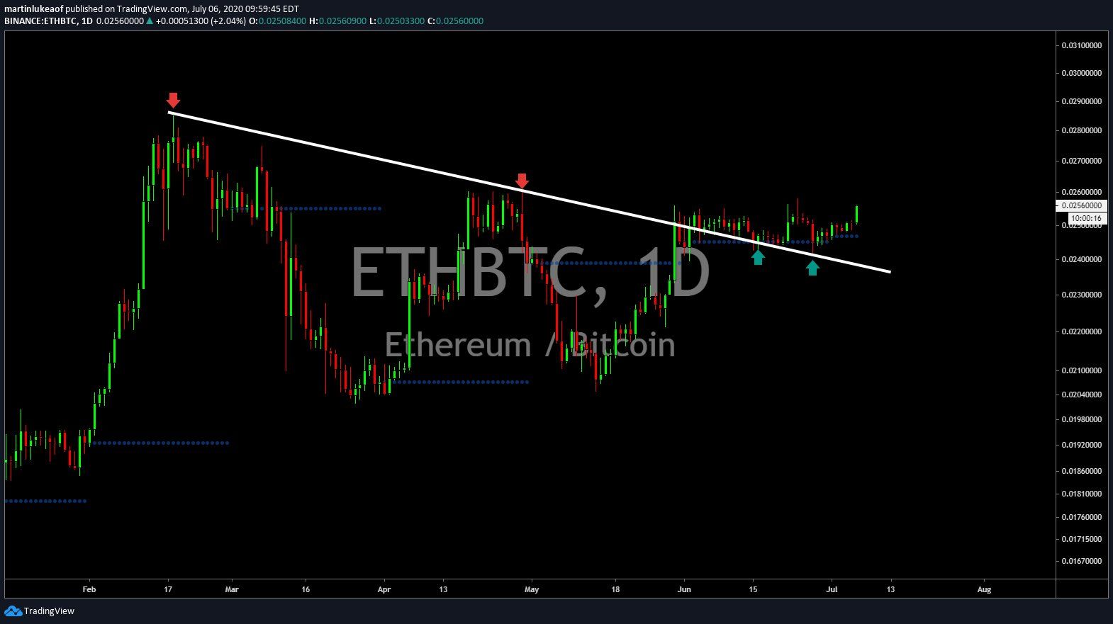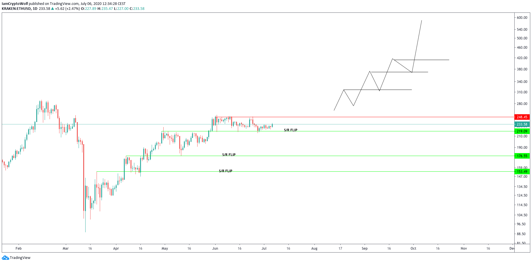 “ETH đang cố di chuyển lên trên sau một tháng 6 dịch chuyển ngang. Những câu chuyện về hành động giá tăng ETH đã ở đó (ETH 2.0, DeFi, EIP 1559) và biểu đồ này ủng hộ điều đó.”