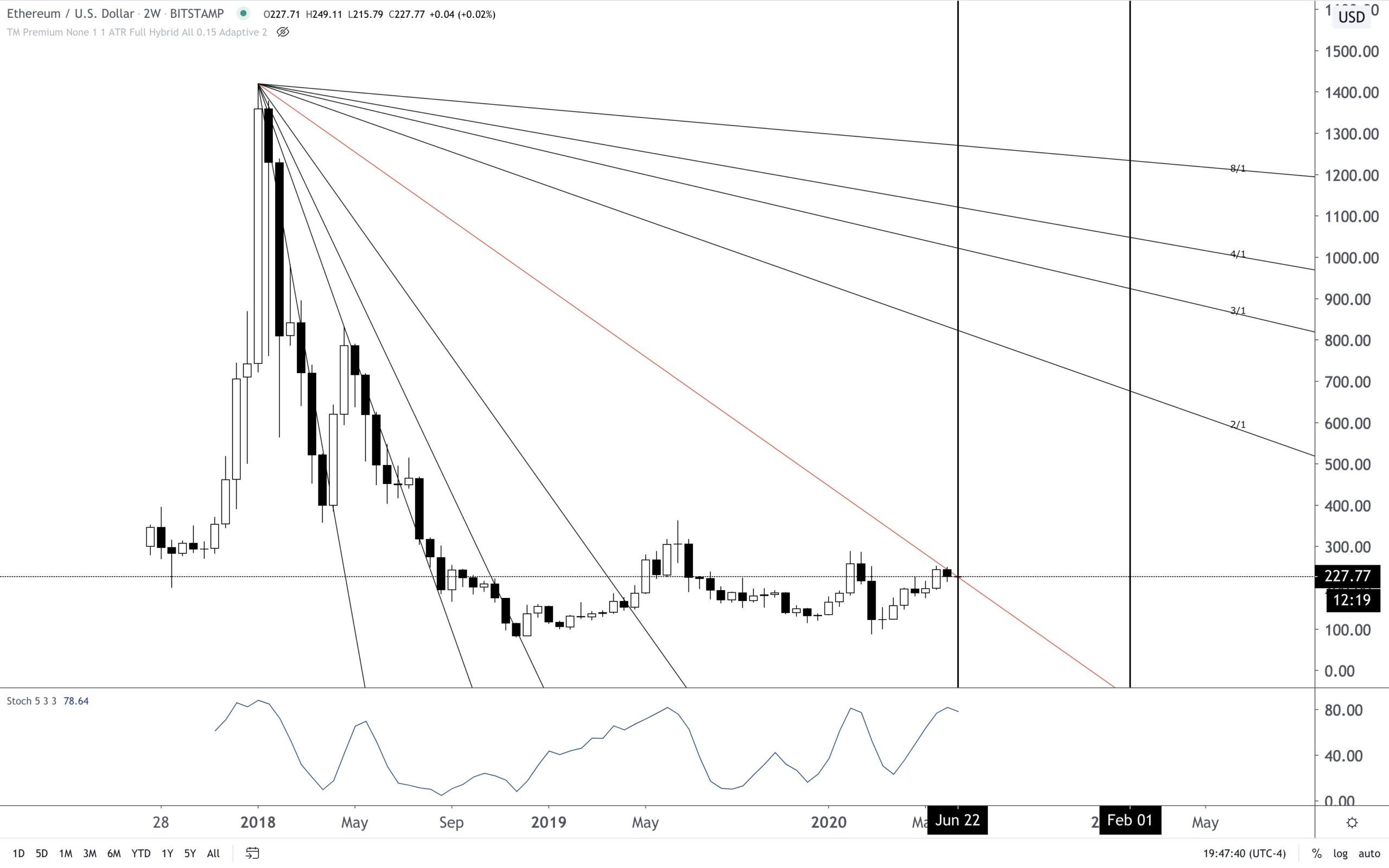 “Có vẻ như ETH đang muốn củng cố sức mạnh, một tín hiệu giá tăng với quạt Gann nằm ở ngay trên trục hàng tháng.”