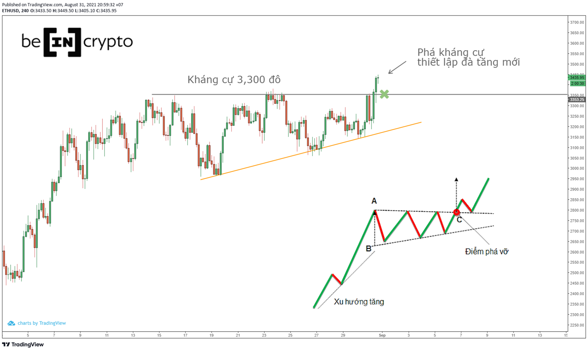 Sponsored- Những ngày qua ETH đã biến động trong mô hình tam giác tăng. Đây là mô hình tiếp diễn xu hướng. Sự tiếp diễn này được xác nhận khi giá vượt qua kháng cự của tam giác. ETH đã làm được điều đó. Đôi khi có thể sẽ có tín hiệu re-test (giá test lại kháng cự) hoặc false breakout (vượt giả).