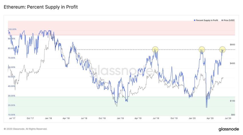 Điều này có liên quan đến hành động giá, bởi vì lần cuối mà 80% nguồn cung ETH sinh lời thì tài sản này đã mất đi 50% chỉ trong 3 tuần. Đó chính là vào khoảng thời gian đỉnh cao của thị trường giá tăng năm 2019.