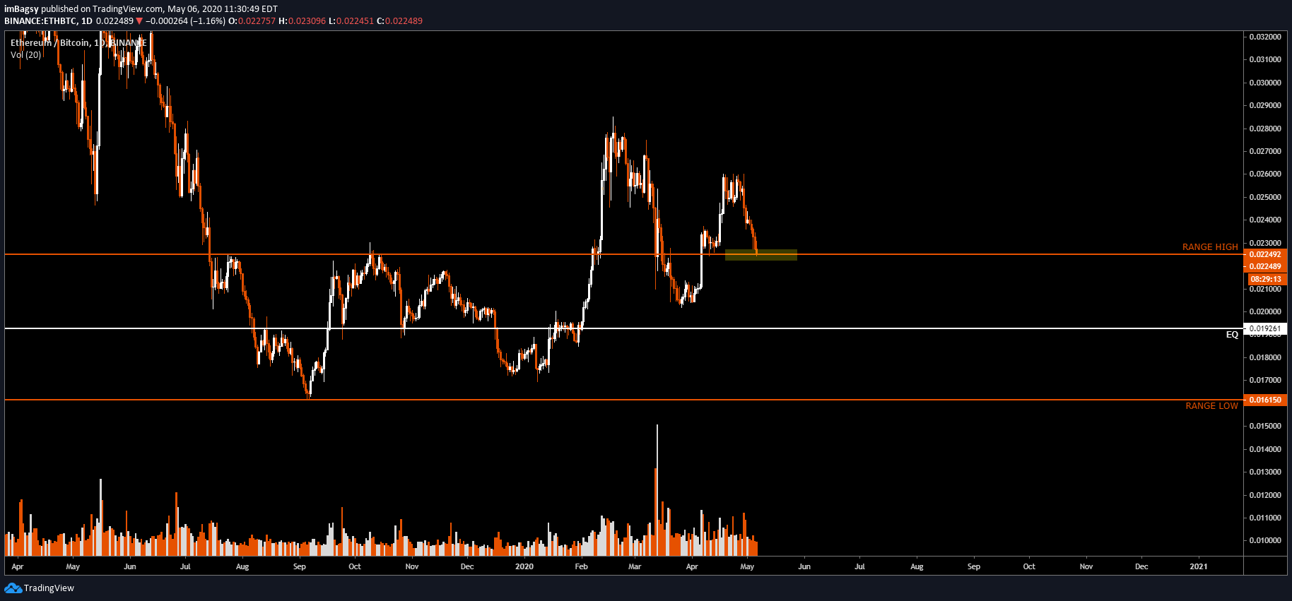 Mặc dù giá ETH đã gần đây đã được cải thiện, nhưng so với BTC, Ethereum đang yếu hơn 3%. Nhà giao dịch tiền điện tử @imBagsy trong một tweet gần đây đã nói về tầm quan trọng của việc ngăn chặn sự suy yếu thêm nữa của ETH so với BTC. Theo ông thì cặp giao dịch ETH/BTC đã chạm đến một ngưỡng quan trọng cần phải được giữ vững.