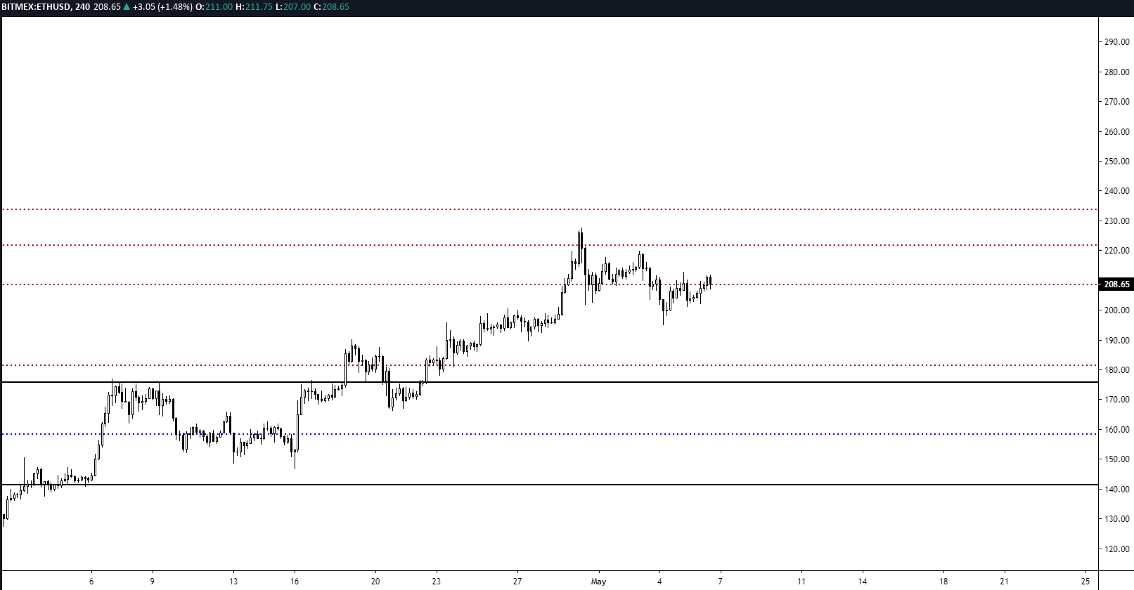 Ethereum (ETH) gần đây không có biến động quá nhiều, chủ yếu diễn biến lên xuống theo thị trường nói chung. Hiện tại, đồng altcoin lớn nhất thị trường đang được giao dịch tại 202 USD, giảm 5,6% từ đỉnh cao của tháng 214 hôm 2/5.