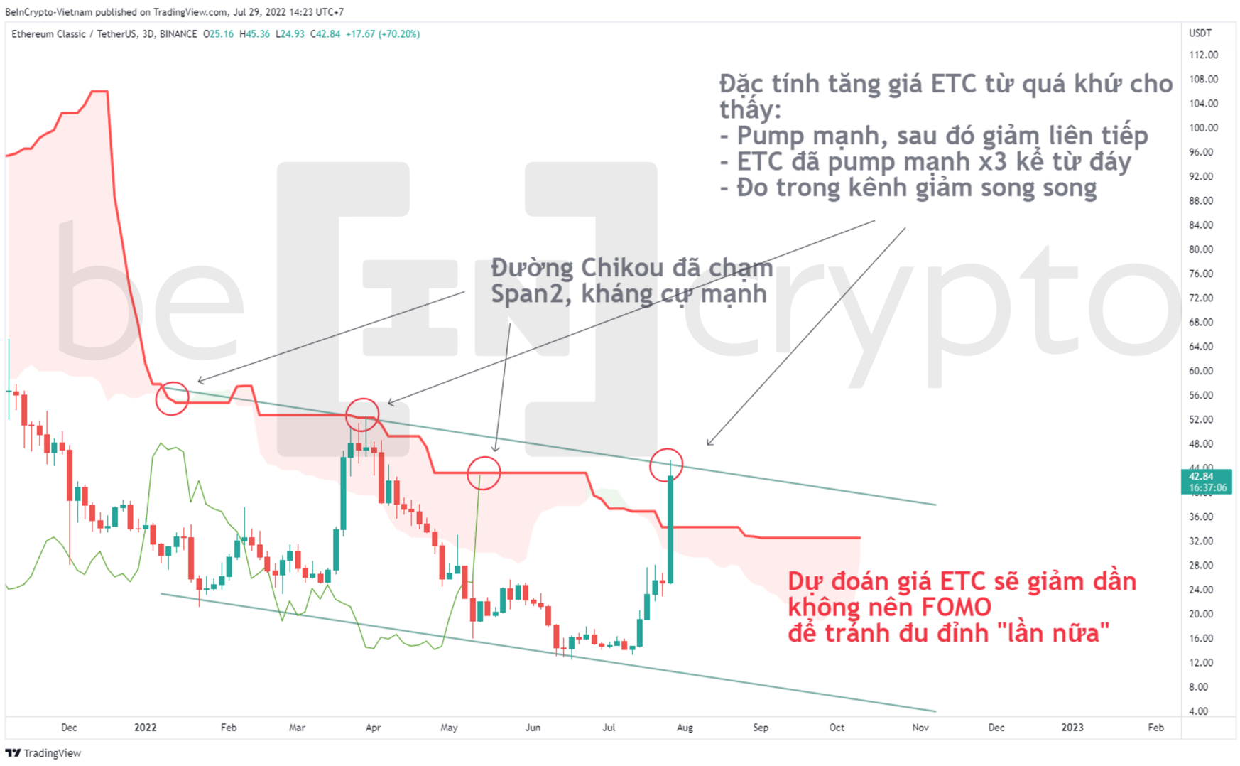 - Khi thị trường chung phục hồi, ETC có thể tăng rất mạnh, vượt hơn kháng cự sideway trước đó mà nhiều Altcoin không thể tăng được như thế. Nhưng sau đó, giá giảm dần và giảm liên tục tìm đáy mới.