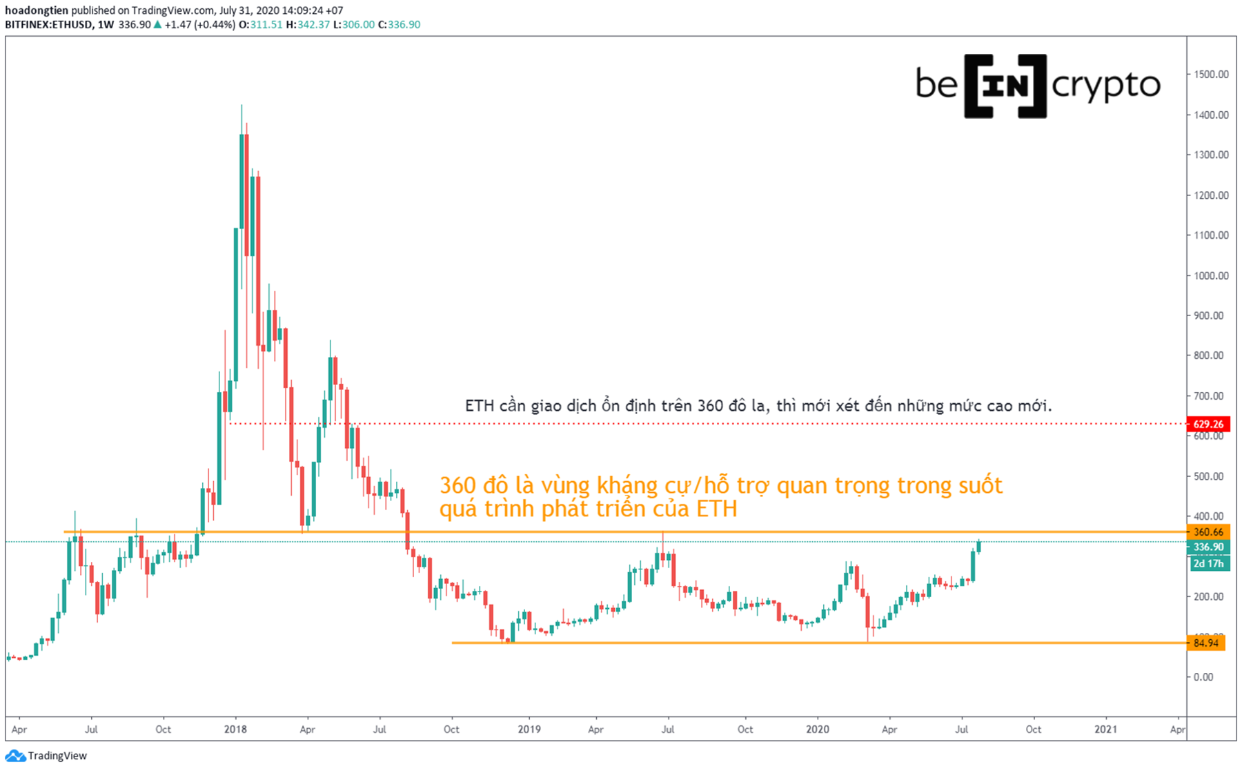 - Khi vùng 360 đô la này bị phá, đã hơn hai năm nay giá ETH vẫn chưa thể nào vượt qua hơn được.