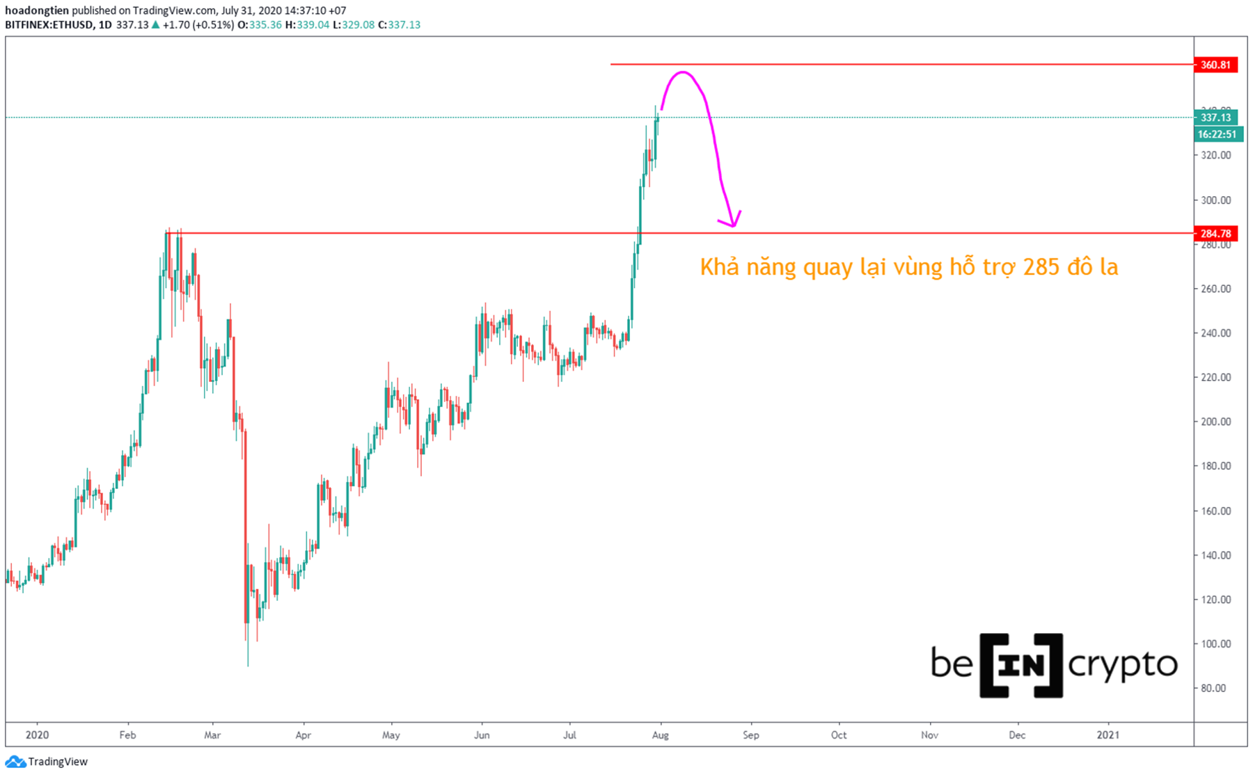 - Khi suy thoái, 360 đô la cũng là vùng hỗ trợ mạnh mẽ để ETH phục hồi.