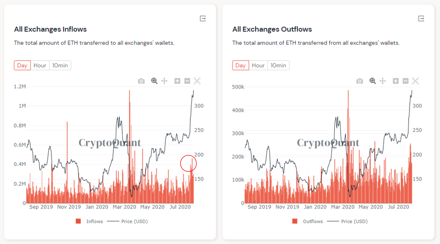 Từ một vài số liệu được cung cấp bởi Cryptoquant, có thể nhận thấy như sau. Hình bên trái là lượng ETH nạp lên sàn, hình bên phải là lượng ETH chuyển khỏi sàn.