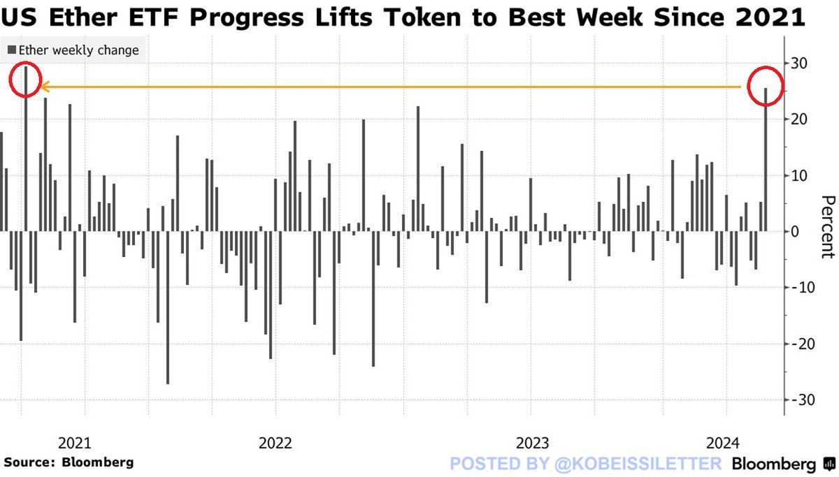Một biên độ tăng giá lớn như vậy hẳn cần rất nhiều lực mua với rất nhiều kỳ vọng. Đến mức, toàn bộ biên độ giảm gần 30% từ đỉnh tháng 3 đã hoàn toàn bị xóa nhòa chỉ sau một tuần lễ. Biên độ tăng này là lời khẳng định ETH bước vào một cơn cường điệu của riêng mình, như BTC ETF đã từng làm với giá BTC.