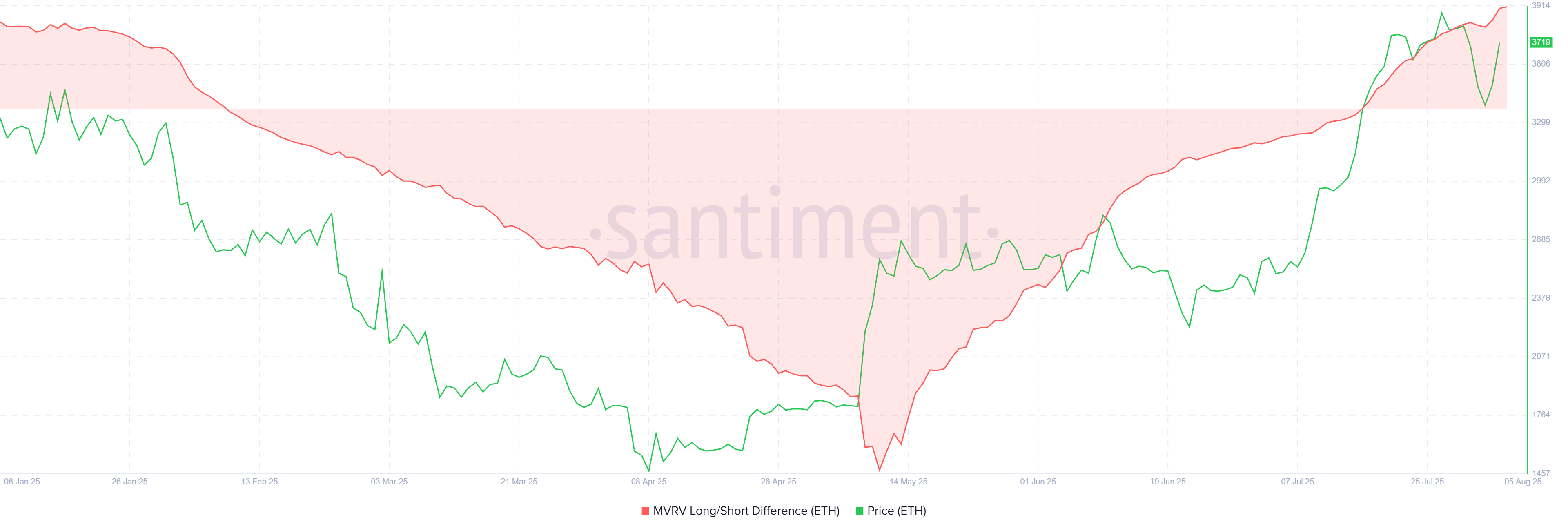 Mặc dù có lượng rút vốn ETF đáng kể, động lực vĩ mô của Ethereum cho thấy các chỉ số tích cực. MVRV Long/Short Difference, đo lường lợi nhuận của những người nắm giữ dài hạn và ngắn hạn, hiện đang ở mức cao nhất trong bảy tháng. Điều này cho thấy những người nắm giữ dài hạn (LTHs) đang chiếm ưu thế trên thị trường Ethereum, hưởng lợi từ lợi nhuận tích lũy của họ.