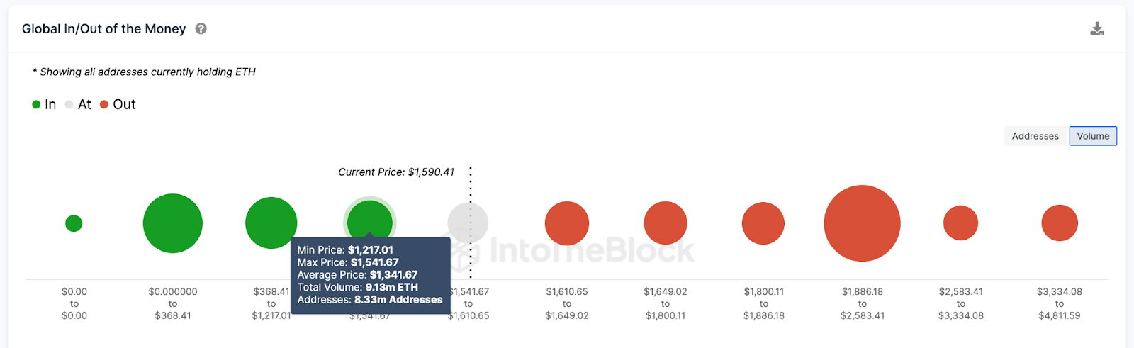 Như được hiển thị bên dưới, có khoảng 8.33 triệu địa chỉ đã mua 9.13 triệu ETH với mức giá tối đa là 1,541 USD. Xem xét lượng nắm giữ lớn, họ có thể sẽ có đủ tiền để chống lại áp lực giảm giá. Ngược lại, phe gấu cũng có thể ngăn phe bò buộc giá tăng lên mức 2,000 USD. Như đã thấy ở trên, có 3.94 triệu địa chỉ đã mua 8.89 triệu đồng ETH với mức giá tối đa là 1,650 USD.