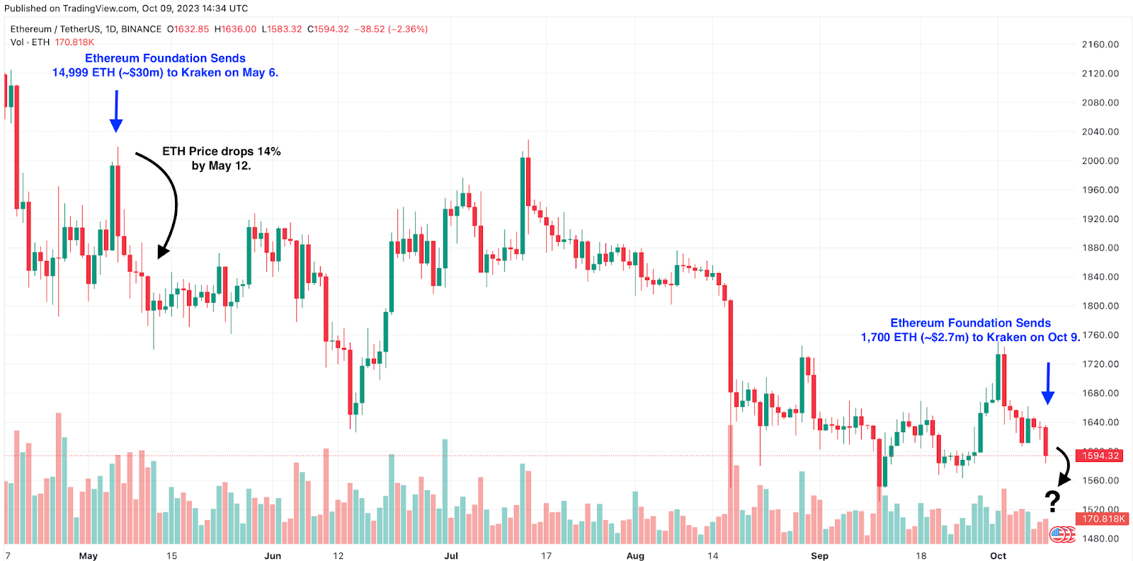 Vào thứ Hai, ngày 09/10, một địa chỉ ví 0x9eE đã được phát hiện đang chuyển 1,700 ETH, trị giá 2.73 triệu USD, vào sàn giao dịch tiền điện tử Kraken. Theo nền tảng phân tích blockchain Arkham Intelligence, ví được liên kết với Ethereum Foundation. Trước đó, dữ liệu lịch sử từ Santiment cho thấy giá Ethereum đã giảm 14% chỉ một tuần sau khi tổ chức này thực hiện một đợt thoái vốn lớn vào ngày 06/5.