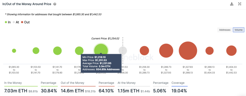 Chỉ số In/Out of Money của IntoTheBlock cho thấy việc giá giảm xuống dưới 1,231 USD, trong đó hơn 923,000 địa chỉ nắm giữ 3.3 triệu ETH, có thể dẫn đến việc bán tháo. Dưới mốc 1,231 USD, có rất ít hỗ trợ cho giá Ethereum.
