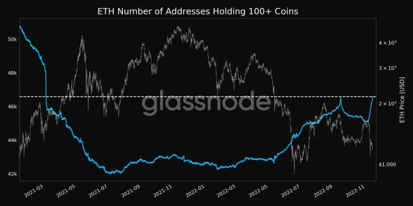 Tuy nhiên, phe mua vẫn đang cố gắng giữ RSI trên vùng quá bán tại biểu đồ ngày. Một xu hướng thú vị là số lượng địa chỉ nắm giữ hơn 100 ETH đã đạt mức cao nhất trong 20 tháng là 46,579 ví.