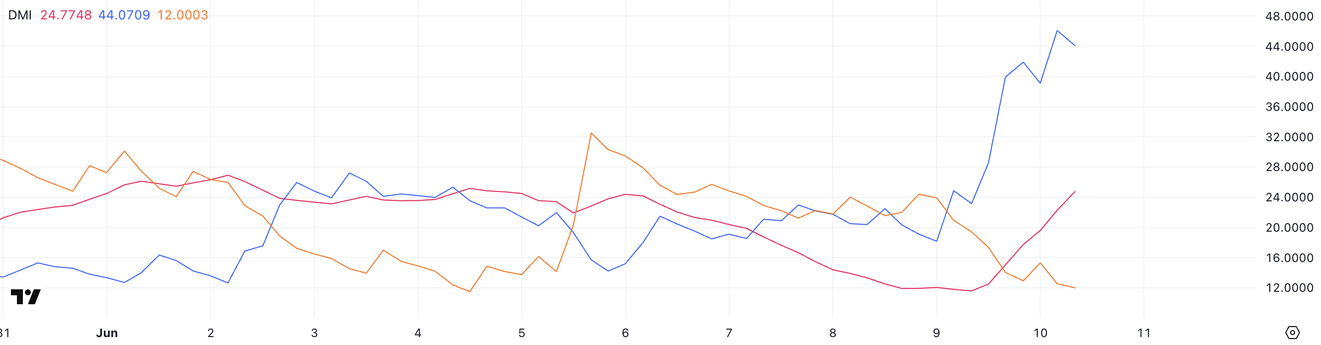 Khoảng cách ngày càng rộng giữa +DI và -DI ngụ ý rằng người mua đang quyết định giành quyền kiểm soát.