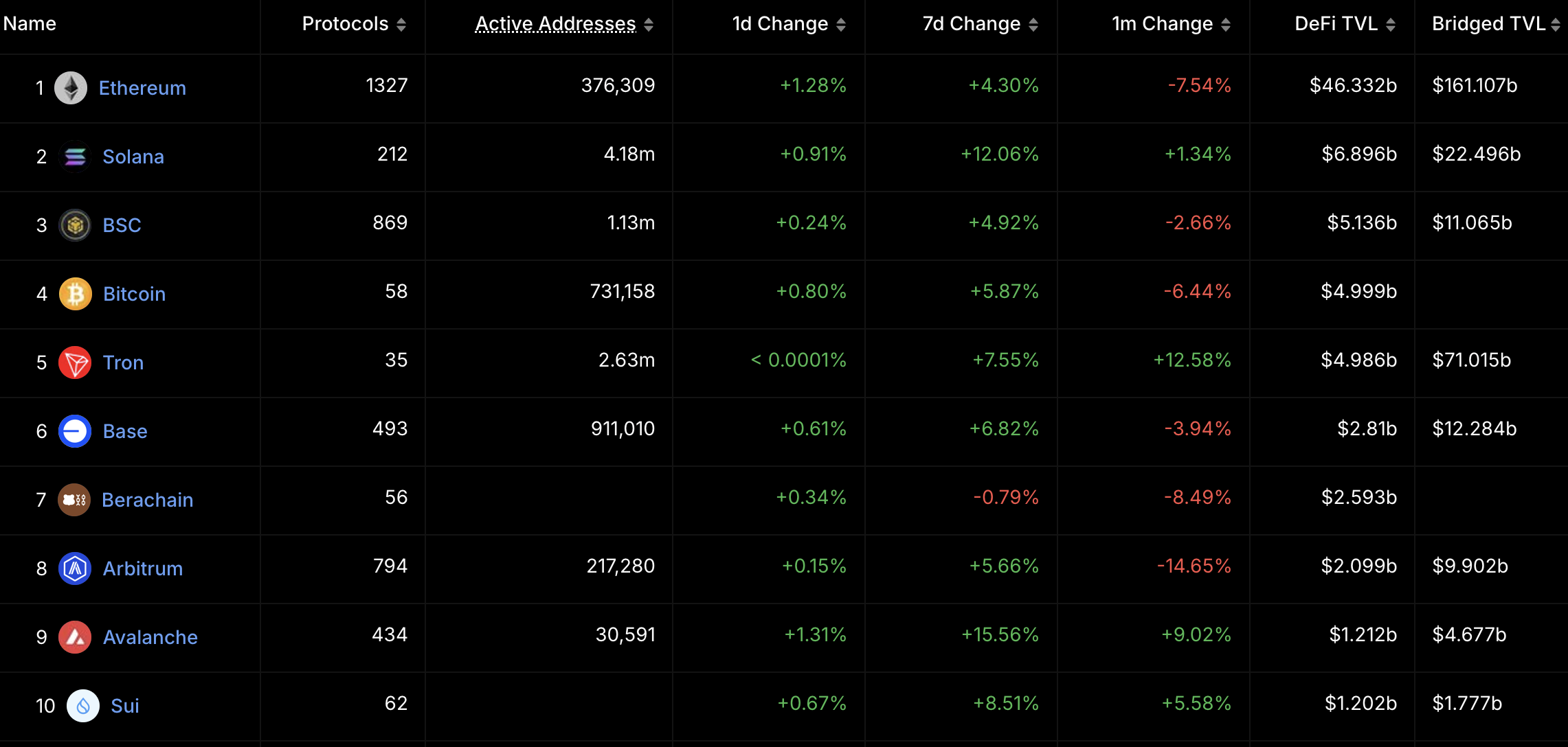 Thứ ba, hệ sinh thái DeFi của Ethereum vẫn là động lực chính cho doanh thu phí. Theo DefiLlama, Tổng Giá Trị Khóa (TVL) trong các giao thức DeFi của Ethereum đạt 46 tỷ USD, chiếm 51% tổng TVL trong thị trường DeFi.