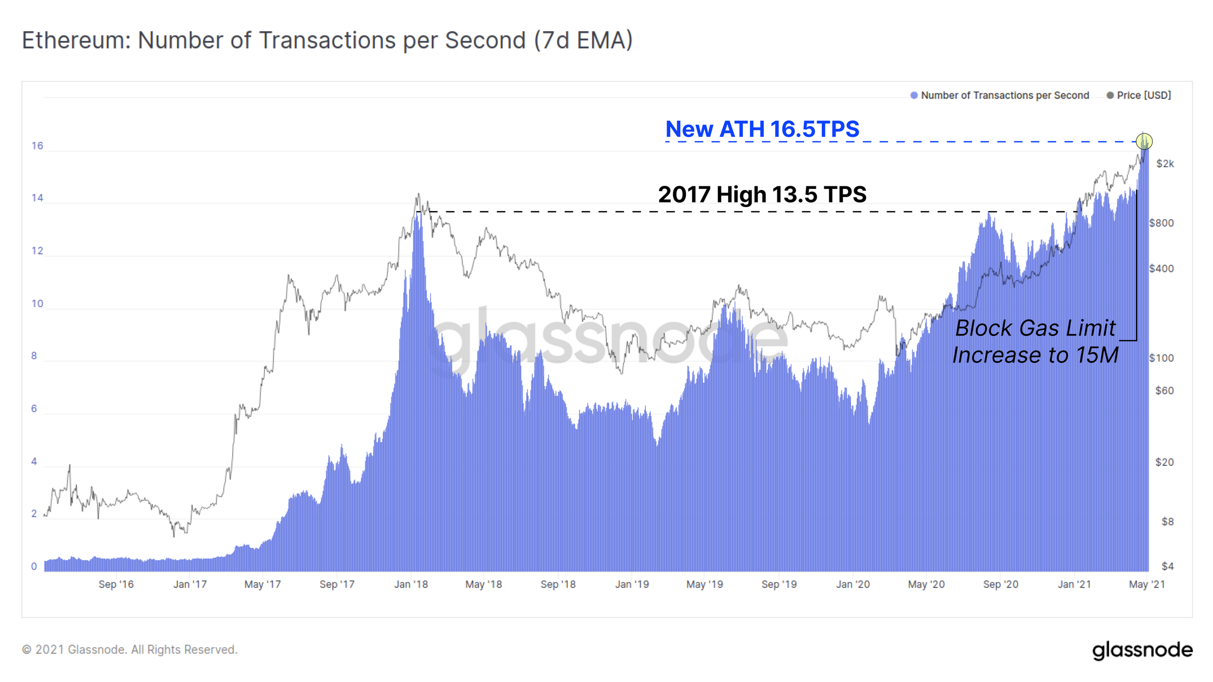 Sau khi các thợ đào Ethereum tăng giới hạn khối gas (block gas limit) lên 15M, tổng thông lượng của chuỗi Ethereum đã đạt mức cao kỳ lục trong tuần này là 16,5 giao dịch mỗi giây. Mức cao được ghi nhận trước đó là 13,5 TPS (Transfer per Second). Mức này lập được ở đỉnh của đợt tăng giá năm 2017.