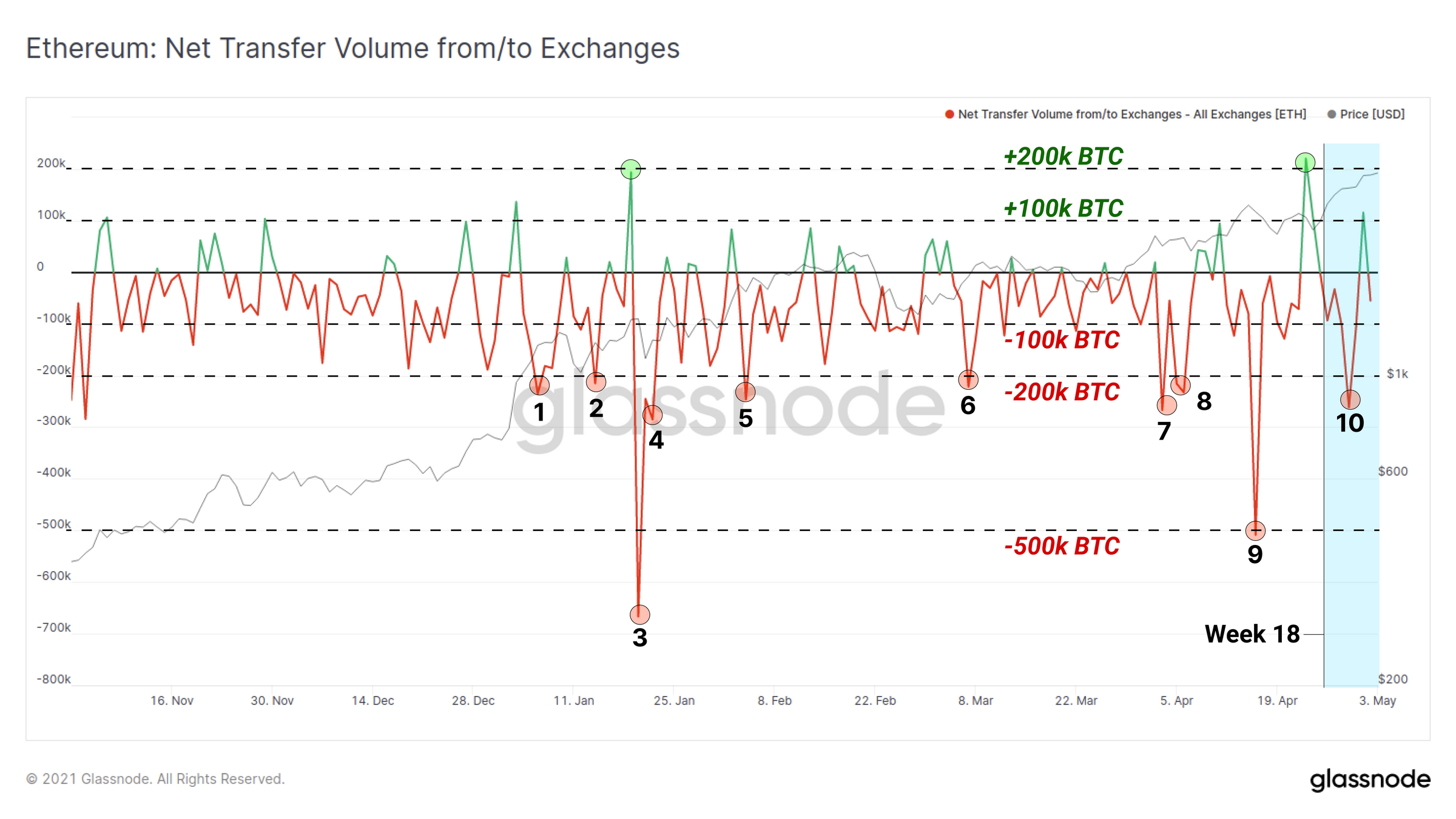Trong hệ sinh thái Ethereum, token ETH được sử dụng như một công cụ duy trì hoạt động của mạng. Trong tuần này, một lượng lớn đáng kể ETH đã được di chuyển khỏi các sàn. Con số này tăng vọt lên hơn 200,000 ETH chỉ trong một ngày. Biểu đồ dưới đây chứng minh rằng vào năm 2021, đã có 10 lần xảy ra hiện tượng này, với số tiền rút trên 200 nghìn ETH/ngày. Trong khi đó, chỉ có khoảng hơn 200,000 ETH chảy vào sàn 2 lần. Điều này cho thấy xu hướng các NĐT ưu tiên việc tự tích trữ coin hơn là để chúng trên sàn.