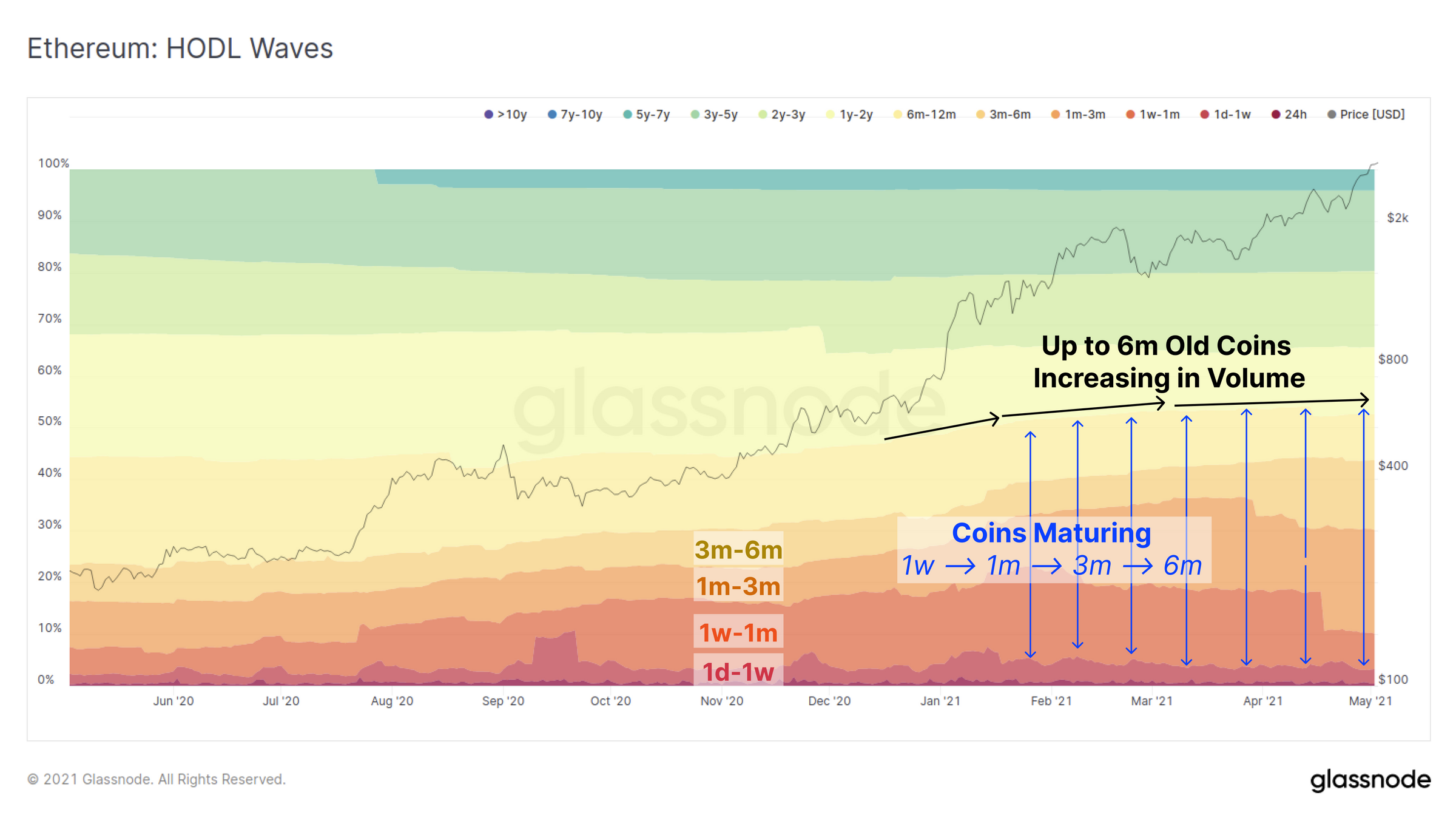 Theo số liệu ghi nhận được từ Glassnode, khi xem xét các dự liệu về lượng ETH lưu thông trên thị trường. Chúng tôi nhận thấy rằng: kể từ cuối năm 2020, có một lượng ETH đã nằm nguyên trong các ví trong một khoảng thời gian dài. Dao động từ 1 tuần đến hơn 6 tháng (mũi tên màu xanh lam). Và tỉ lệ này vẫn đang tăng dần. Điều này cho thấy nhiều NĐT đã tích lũy ETH ngay từ khi xu hướng tăng giá mới bắt đầu.