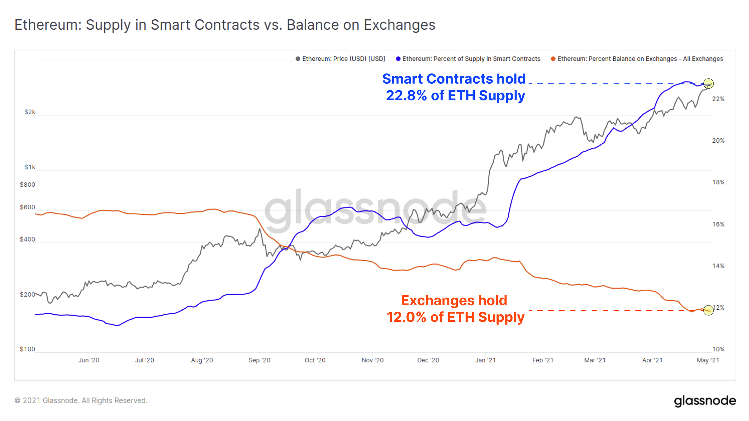 Bên cạnh đó, lượng ETH bị rút khỏi các sàn giao dịch tập trung còn đang chảy một phần vào các hợp đồng thông minh và ứng dụng DeFi. Biểu đồ bên dưới so sánh phần trăm tổng nguồn cung ETH do các sàn giao dịch nắm giữ (màu cam, 12,0%) so với số tiền được ký gửi trong các hợp đồng thông minh (màu xanh lam, 22,8%). Điều này cho thấy người dùng ETH đang có nhu cầu lớn về DeFi.
