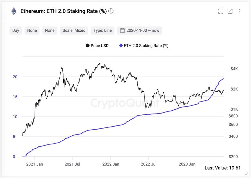 Theo nền tảng phân tích on-chain, gần 20% nguồn cung Ethereum hiện đã được staking (đặt cọc). Hơn nữa, hoạt động này đã có một sự gia tăng mạnh 5% trong hai tháng qua.