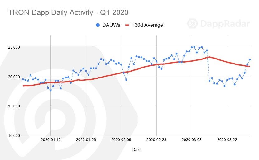 Trong khi đó, TRON đã sụt giảm 20% về hoạt động hàng ngày trên các dapp vào giữa tháng 3. Sự sụt giảm vẫn chưa thực sự xảy ra cho đến 15/3, 3 ngày sau vụ đổ vỡ của thị trường coin. Kết thúc quý 1, hoạt động trên các dapp của TRON tăng 18%, nhưng giảm 15% so với cùng kỳ năm ngoái.
