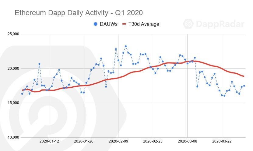Theo báo cáo của công ty phân tích DappRadar thì hệ sinh thái dapp của Ethereum đã tăng trưởng 16% về số ví riêng hoạt động tích cực hàng ngày trong quý 1/2020. Tính đến cuối tháng 3/2020, có 17.489 ví tích cực hoạt động trên Ethereum, tăng trưởng 64% so với 1 năm trước đó.
