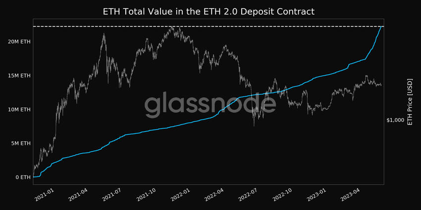 Theo dữ liệu của Glassnode, tiền nạp Ethereum đã staking đã tăng lên mức cao nhất mọi thời đại (ATH) mới là 22.2 triệu coin. Điều này có nghĩa là hiện tại có nhiều ETH bị khóa trên beacon chain hơn so với những ETH được giữ trên các sàn giao dịch tập trung.