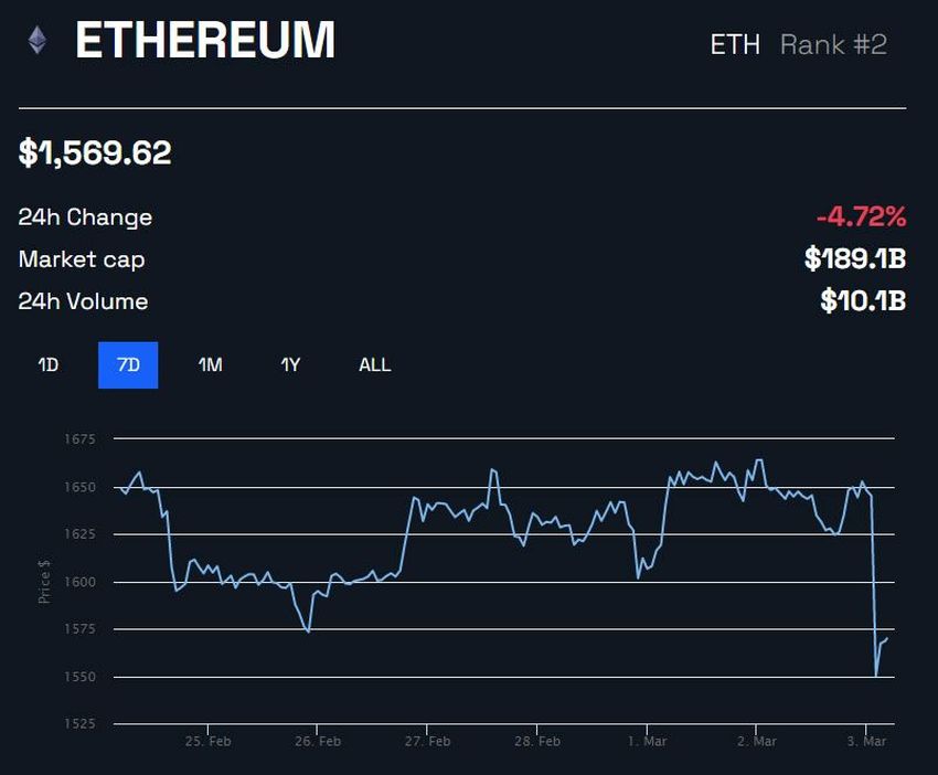 Bản nâng cấp mới nhất là một bước tiến lớn cho mạng Ethereum. Tuy nhiên, các khoản lỗ từ BTC đang kéo giá ETH giảm mạnh vào ngày hôm nay. Cụ thể, ETH đã giảm 4.8% trong phiên giao dịch châu Á sáng thứ 6. Thậm chí, ETH đã giảm xuống mức thấp nhất trong hai tuần là 1,569 USD tại thời điểm BeInCrypto viết bài.