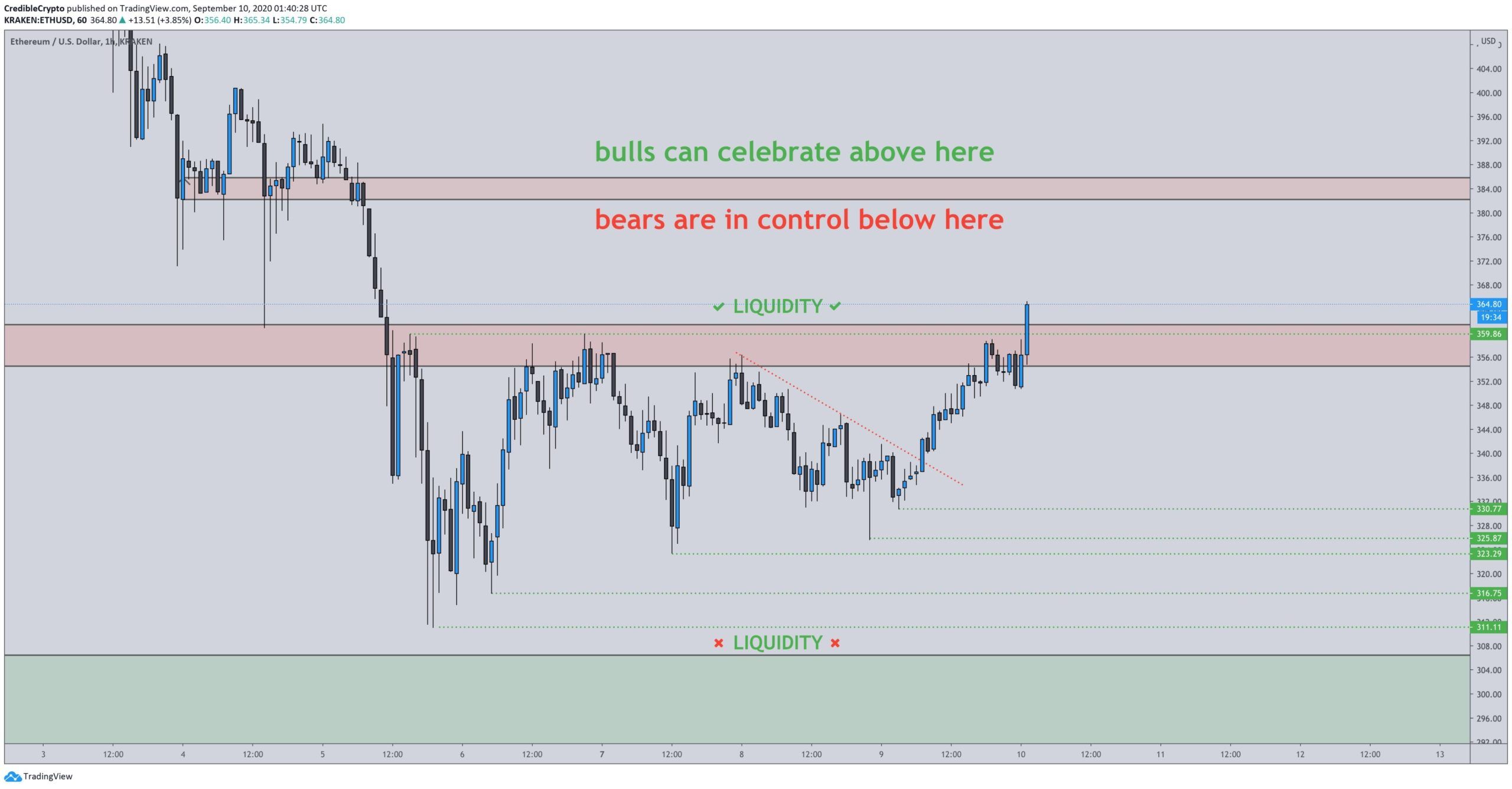 Bất chấp những cải thiện giá gần đây thì nhìn nhận của các nhà phân tích là Ethereum vẫn nằm trong địa phận thị trường giá giảm. Nhà giao dịch @CredibleCrypto gần đây chia sẻ một biểu đồ cho thấy, ETH vẫn nằm dưới khu vực quan trọng 382 USD – 385 USD. Đây là dấu hiệu cho thấy thị trường giá giảm vẫn đang kiểm soát.