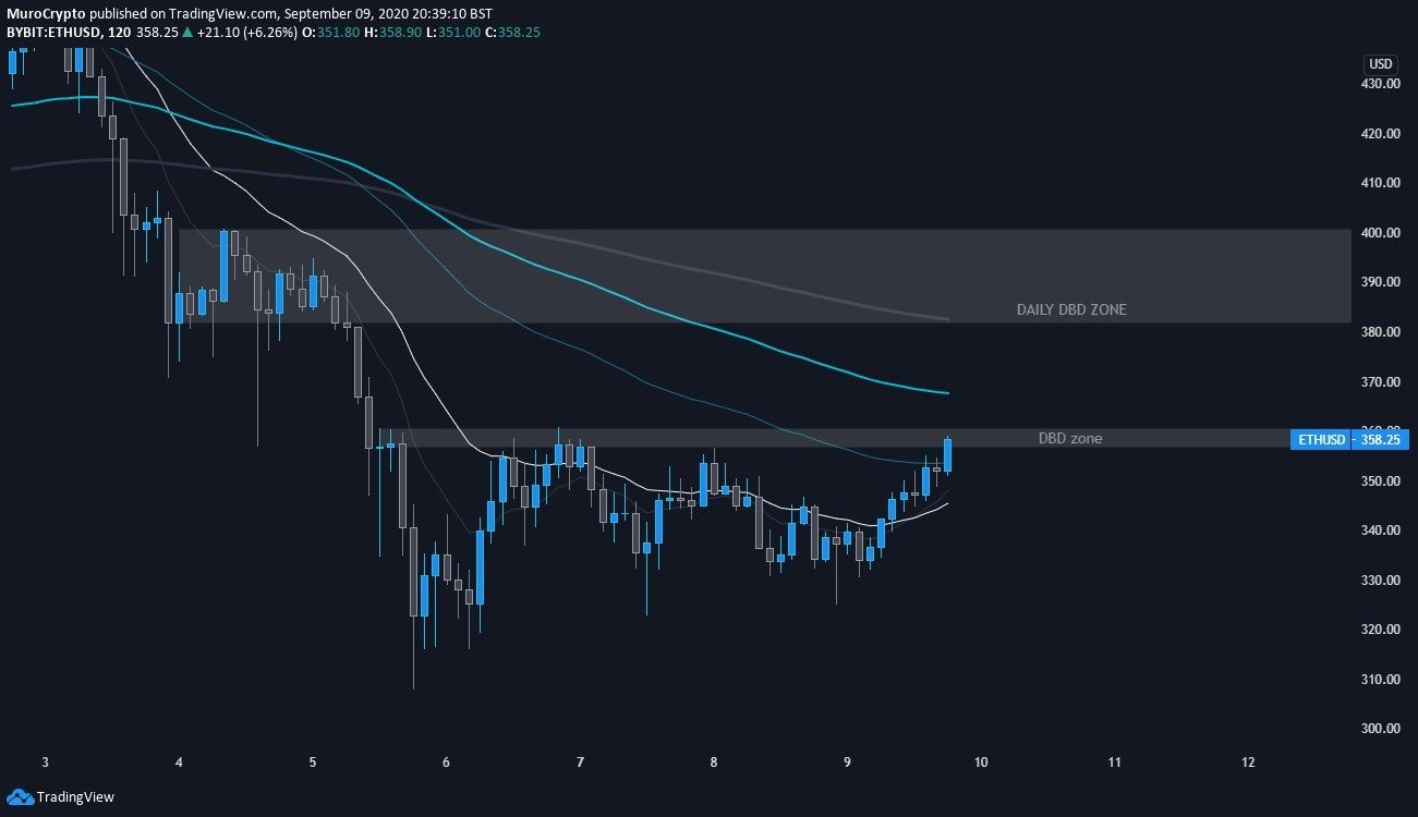 “ETH có lẽ phá vỡ được ngưỡng kháng cự 360 USD vào lúc này. Tuy nhiên, có một cụm EMA và kháng cự khu vực nguồn cung tại ngưỡng 380 USD sẽ có khả năng cao là đẩy nó trở lại. Cho đến nay thị trường altcoin trở nên rõ ràng hơn thì vẫn chỉ đầu cơ.”
