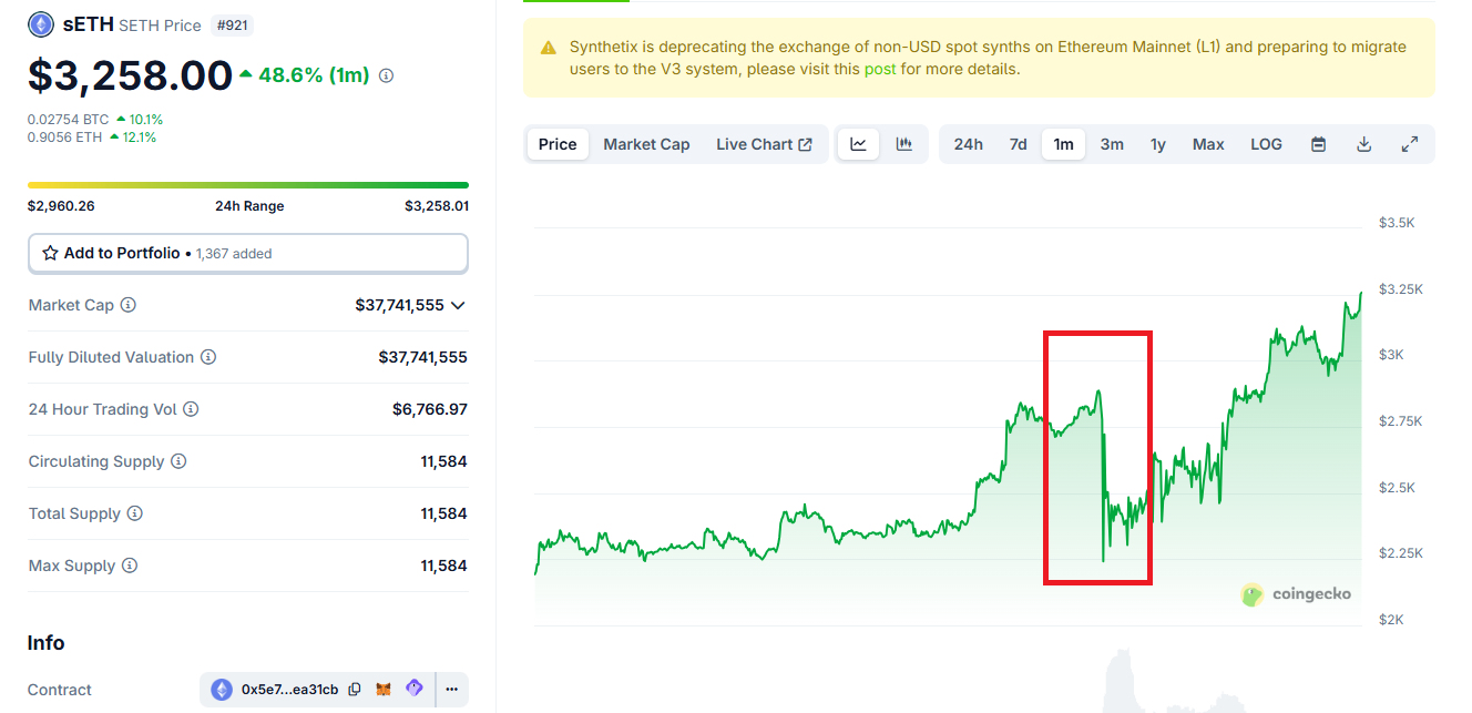Trong khi đó, sETH—Synthetic ETH do Synthetix phát hành—tăng 30.5% trong tuần, cho thấy nhu cầu về các lựa chọn thay thế trong bối cảnh biến động.