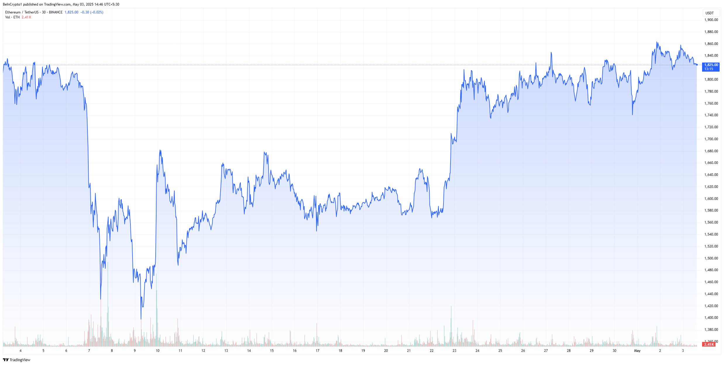 Sự biến động trong hành vi của cá voi trùng hợp với thị trường tiền điện tử bị ảnh hưởng bởi nhiều yếu tố. Theo BeInCrypto, giá ETH tăng 10% trong một tuần nhưng giảm nhẹ trong 24 giờ qua. Nó đang dao động quanh mức 1,842 USD—một sự giảm đáng kể so với đỉnh tháng 03/2025 là 2,500 USD.