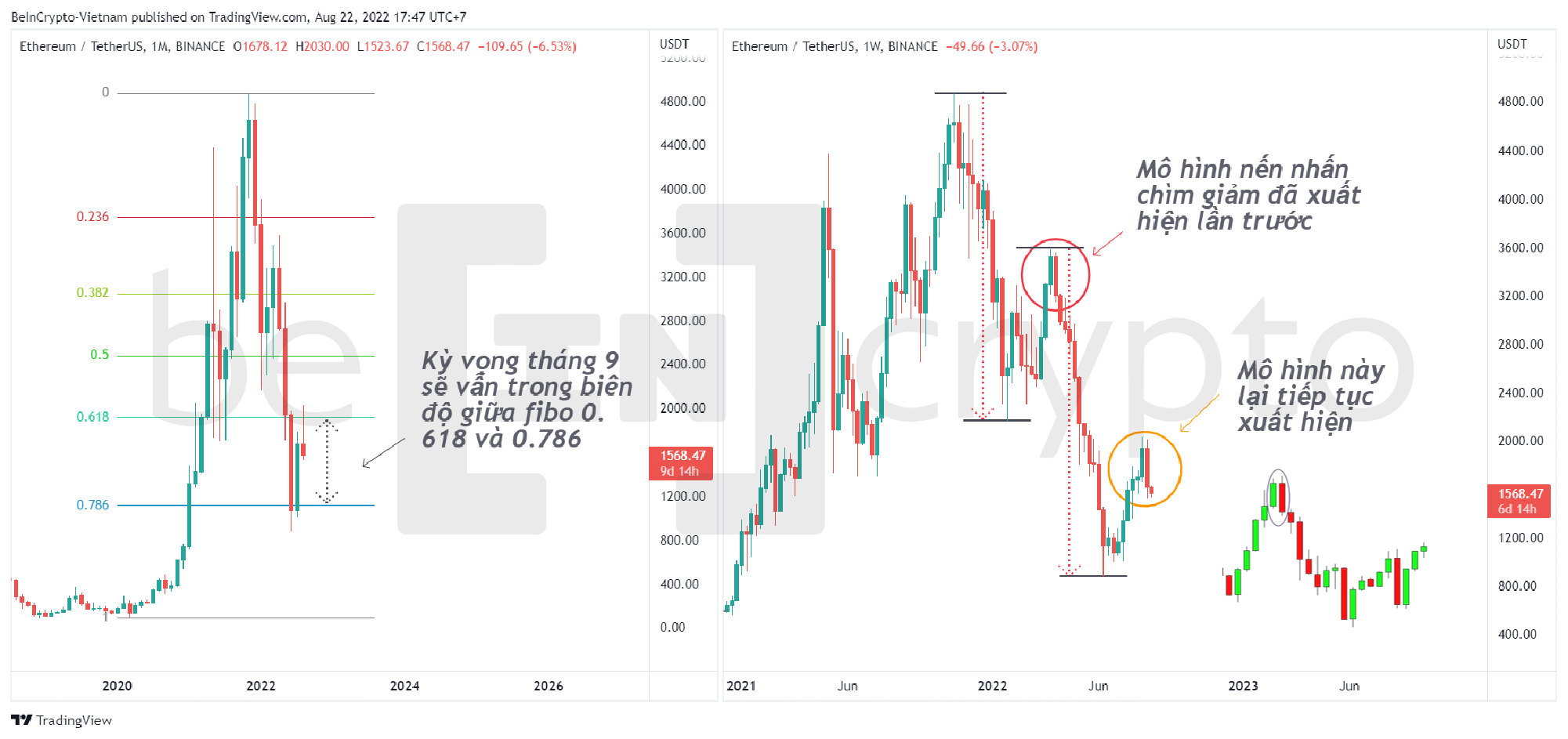 - Khung tháng của ETH dù chưa đóng nến nhưng với râu nến trên hiện tại khá dài chứng tỏ phe bán đang chiếm ưu thế. Giá hiện đang thấp hơn giá đóng cửa của tháng trước đó. Khả năng tháng 9 khó tạo mức cao hơn.