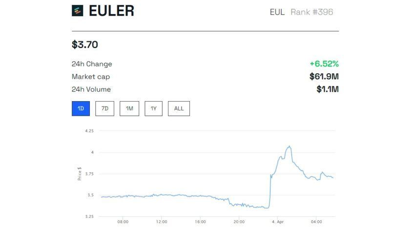 Không quá khó hiểu khi mã thông báo của Euler, EUL, đã phản ứng tích cực với tin tức gần đây về vụ hack. Mã thông báo đã tăng tới 20% từ 3.36 USD lên 4.05 USD. Kể từ đó, EUL đã ổn định trở lại mức 3.70 USD tại thời điểm viết bài.
